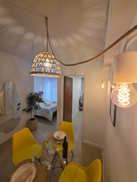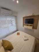Moderno ambiente dividido totalmente refaccionado, con amplio ventanal de piso a techo que brinda excelente luminosidad natural. El departamento cuenta con cama sommier de dos plazas a estrenar, respaldo con mesas de luz incorporadas, mesa con cuatro sillas nuevas, rack con Smart TV de 32 pulgadas, aire acondicionado frío/calor, plantas decorativas, perchero de pie, cortinas y acolchado nuevos. Además posee caja fuerte y persiana eléctrica.