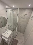 Baño completo con mampara, inodoro y bidet Ferrum línea Bari, vanitory de madera blanca laqueada, grifería Piazza, secador de pelo tipo hotel y equipamiento completo.