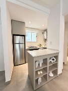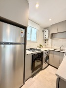 Cocina separada, con cortinas roller Screen Sheer, heladera con freezer, microondas, cocina Escorial y lavarropas automático Dream.
