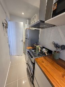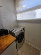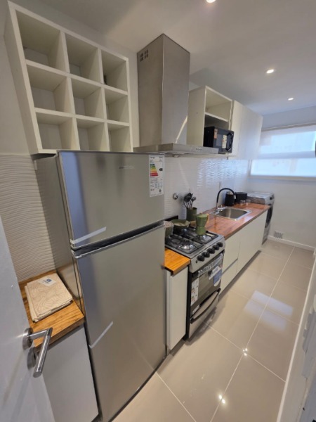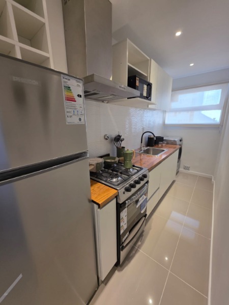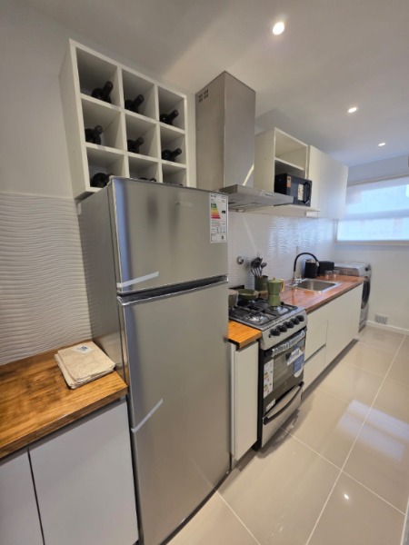 La cocina, separada y con lavadero, se encuentra totalmente equipada con lavarropas Philips a estrenar, heladera con freezer Philips nueva, microondas Atma nuevo, pava eléctrica Atma, tostadora Atma, cocina semi industrial Escorial nueva y extractor TSC. También cuenta con una bodega con vinos, vajilla, cubiertos tipo hotel, utensilios Hudson —incluyendo cafetera italiana, cacerola, sartén y cuchilla—, y todo lo necesario para un uso inmediato. Se colocaron cortinados nuevos tanto en la cocina como en el ambiente principal.