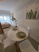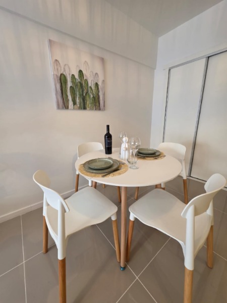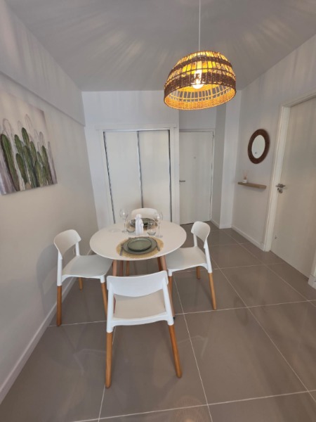 El ambiente principal está equipado con una cama sommier de dos plazas a estrenar, respaldo con mesas de luz incorporadas, mesa con cuatro sillas nuevas, rack con TV Smart de 32 pulgadas, placa caloventor nueva, plantas naturales, acolchado y decoración completamente renovada. Además, se realizaron trabajos de refacción que incluyen la bajada de techos en cocina y baño, mejorando la estética y la funcionalidad.