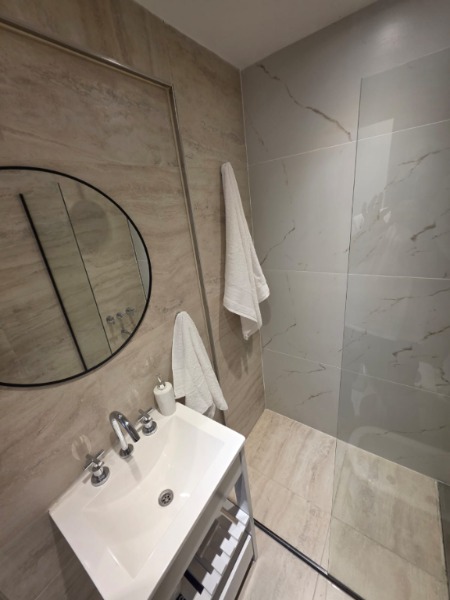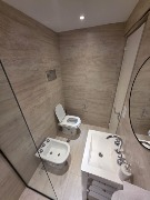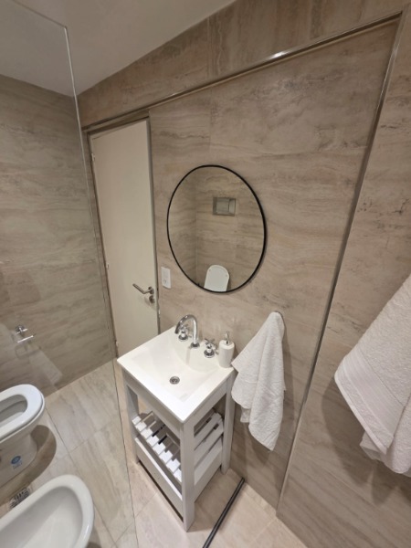 El baño, completamente renovado, dispone de mampara, inodoro y bidet Ferrum línea Bari, vanitory de madera blanco laqueado y grifería Piaza, logrando un espacio moderno y funcional.