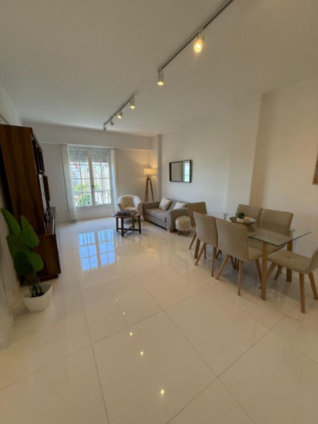 Se entrega completamente equipada, tal como se ve en las fotos, con muebles, electrodomésticos y decoración: lavarropas Dream, cocina Escorial con horno, heladera con freezer, microondas, mesa de vidrio con seis sillas, sillón de dos cuerpos, matera, puff de apoyo, mesa ratona de madera patiribi redonda, sommier Cannon de dos plazas, sommier de una plaza, respaldos, mesas de luz, ropa de cama, cortinas, mueble de TV, televisor Smart HD de 32 pulgadas, iluminación completa y puertos USB en dormitorio y living. Todas las cañerías de luz, gas y agua han sido renovadas. El edificio cuenta con solo cuatro unidades por piso.
